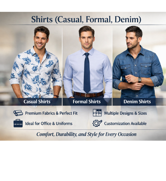 We manufacture high-quality shirts in Casual, Formal, and Denim styles, crafted to deliver comfort, durability, and a refined look. Our shirts are made from premium fabrics with precise stitching and excellent finishing to ensure long-lasting wear and a perfect fit. Available in multiple designs, patterns, and sizes, our shirts are suitable for everyday wear, office use, corporate uniforms, and bulk orders. We also offer customization options to meet brand-specific requirements while maintaining consistent quality and timely delivery.